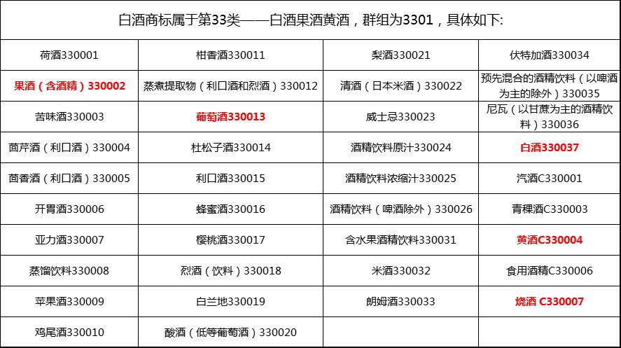 根據(jù)《商標(biāo)注冊用商品和服務(wù)國際分類表》,酒類商標(biāo)屬于第33類,具體涵蓋白酒、果酒、黃酒等(群組3301)。注冊前務(wù)必確認(rèn)類別,避免因分類錯誤導(dǎo)致注冊失敗。
